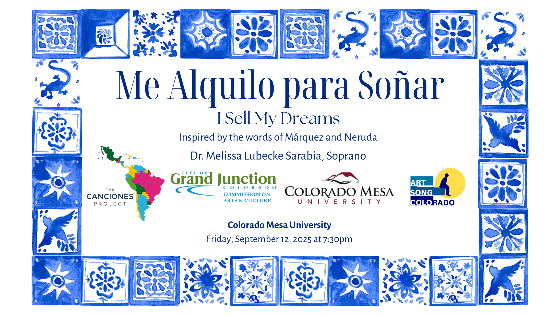 Inspired by Gabriel García Márquez's short story of the same name, Dr. Melissa Lubecke Sarabia and Steven Aguiló-Arbues create a musical journey from Colombia to Cuba with stops in Mexico, Spain and more. Experience art song newly curated by the Canciones Project, as part of their ongoing mission to share the gorgeous music of South America with a larger audience.